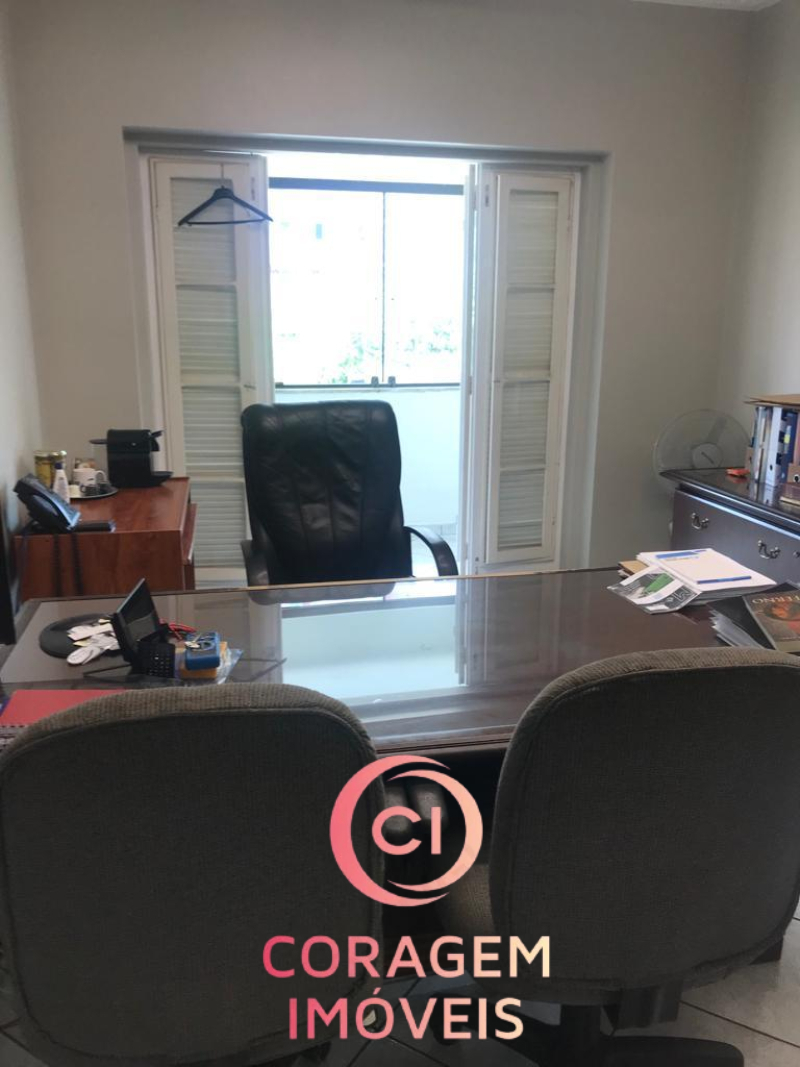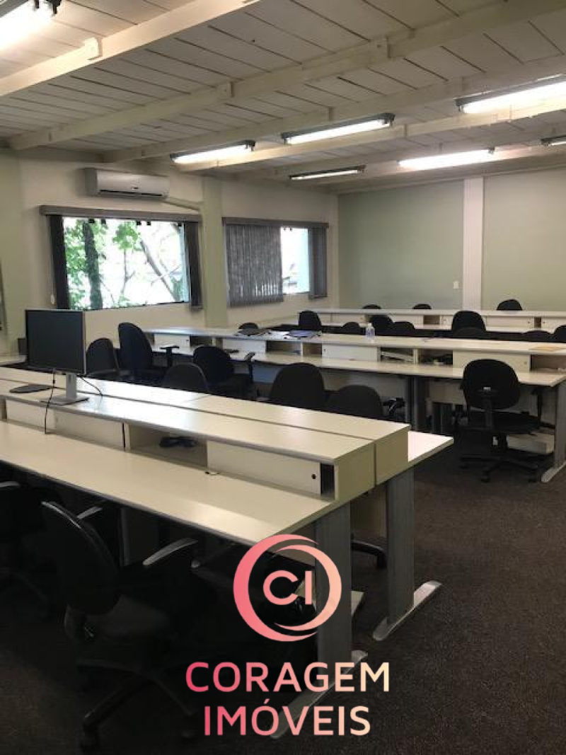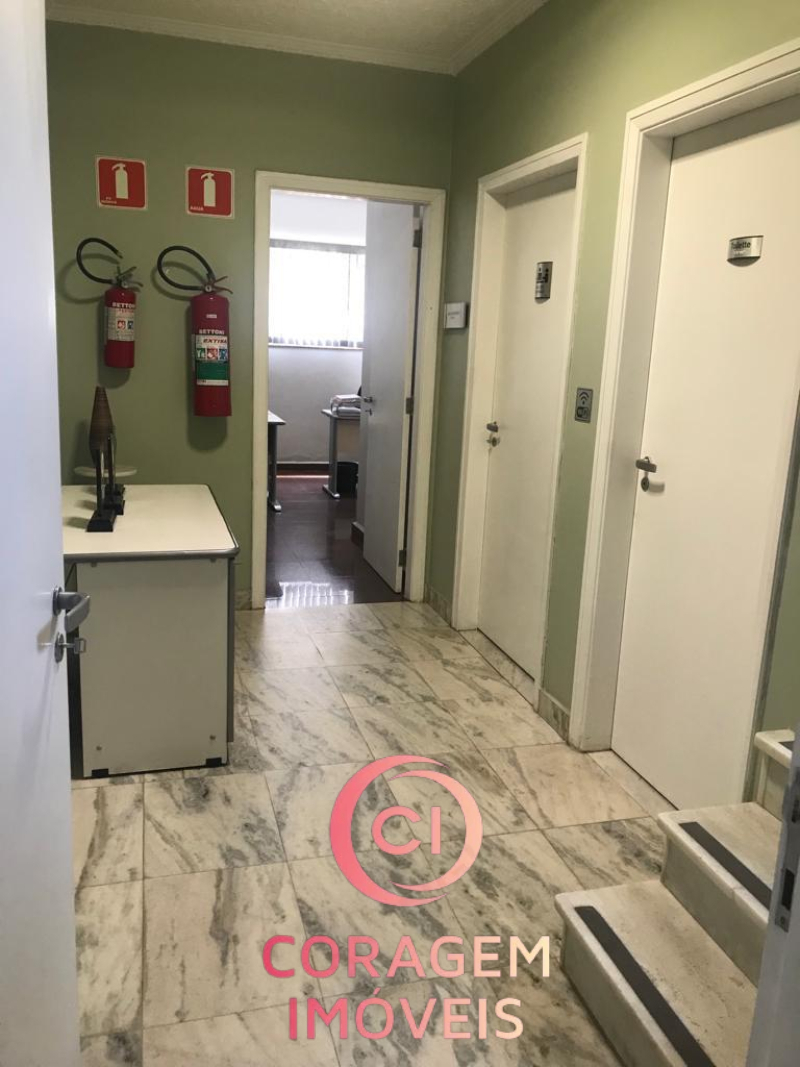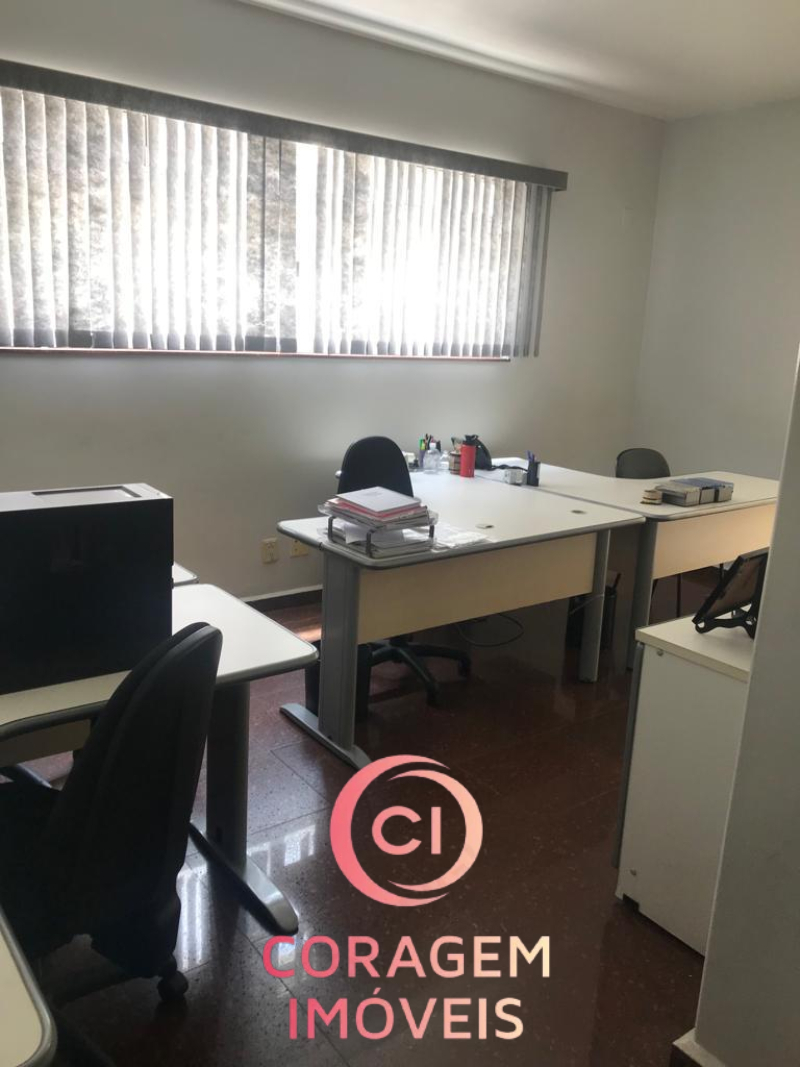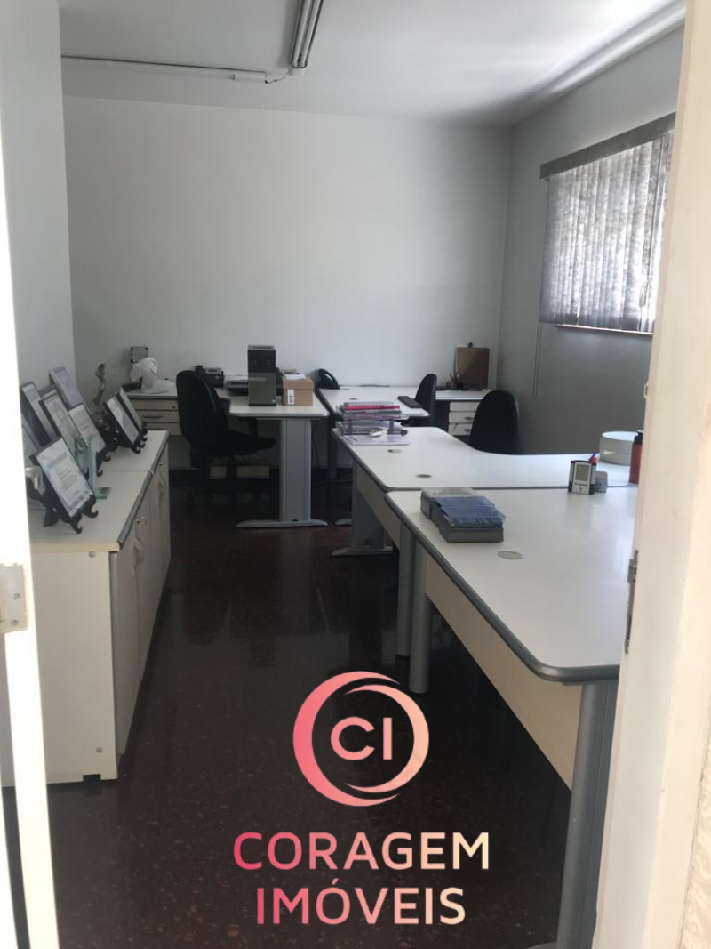 Portão para pedestres e carro (2 ou vagas), recepção, 5 salas de trabalho, 2 salas de reunião, 4 banheiros, inclusive para deficientes, auditório, copa/café, entre o pavimento inferior e superior.